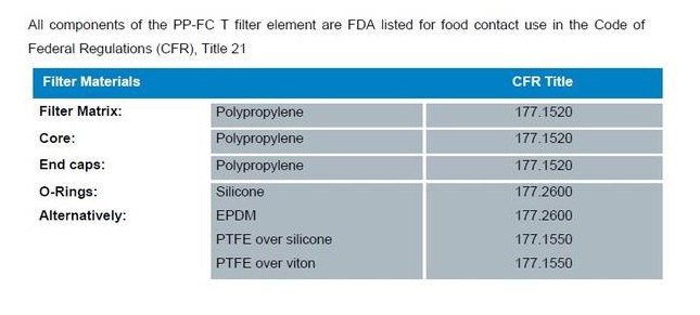 Tất cả các thành phần đều đáp ứng các yêu cầu của EU và Hoa Kỳ về Sự tiếp xúc trực tiếp với thực phẩm theo CFR (Code of Federal Regulations) Mục 21 và 1935/2004/EC. Lọc PF-FC T được thiết kế và phát triển như lọc trước với các hạt bụi thô hoặc như là bộ lọc cuối cùng với hiệu quả về chi phí.